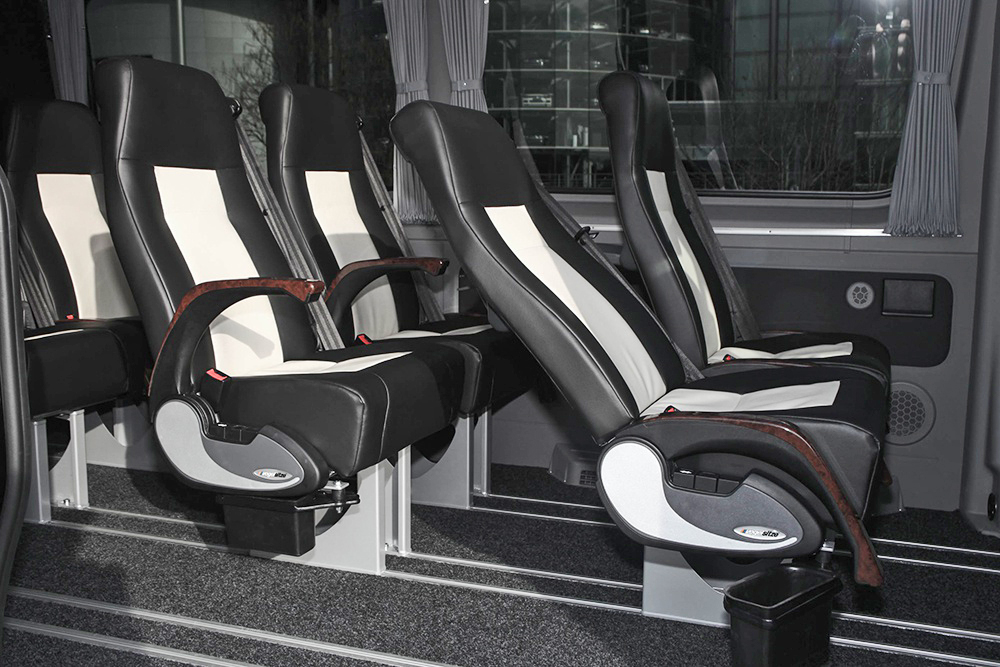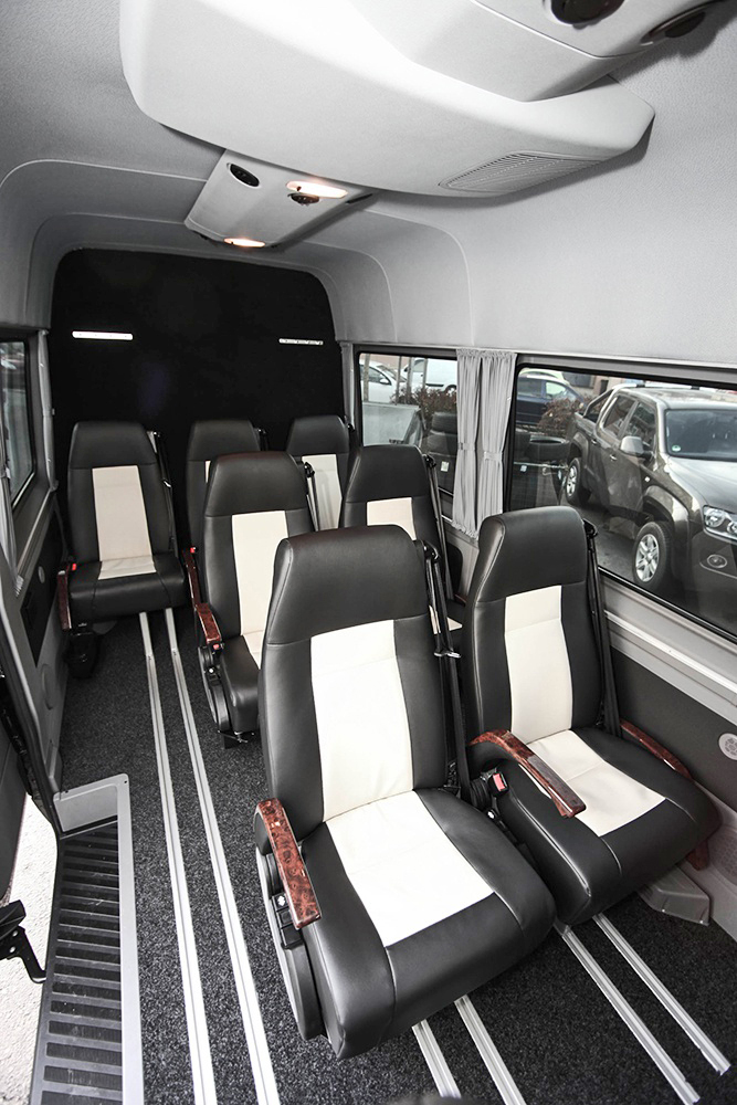 - Einzel-Komfortsitze aus Leder mit verstellbarer Rückenlehne, Bestuhlung 2-2-2-3 (1 davon Fahrer), 4 Sitze 360° drehbar, auf Wunsch mit Tisch, LCD Monitor, CD/DVD/Playstation 2, Subwoofer, LED Nachtbeleuchtung, Leselampen, 220V Steckdose am Sitzplatz, Mobiles Internet LTE, , Doppelklimaanlage vorn und hinten, Standheizung, elektrische Schiebetür, Alarmanlage mit Innenüberwachung, schwarz getönte Scheiben, Navigation (GPS), Automatik, Dimmbare Nachtbeleuchtung
